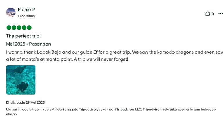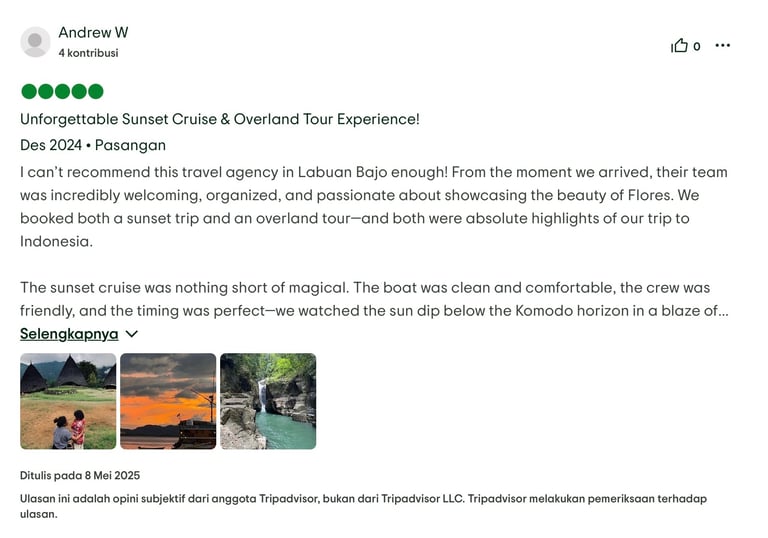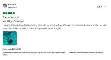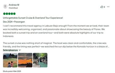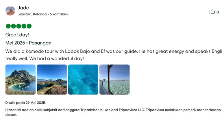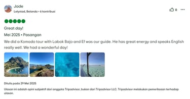 “Pengalaman saya dengan Labok Bajo dimulai dari acara IFG Labuan Bajo Marathon. Mereka menemani saya selama acara tersebut. Selanjutnya, saya mengikuti paket trip sehari penuh yang mereka tawarkan, di mana saya mengunjungi 6 destinasi di Taman Nasional Komodo. Dari segi pelayanan, Labok Bajo sangat ramah, aman, dan nyaman. Jadi menurut saya, harga yang mereka berikan sangatlah wajar.”